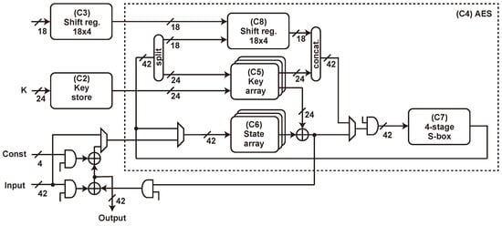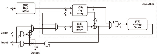 Datapath diagram of our design without threshold implementation (TI). (C1)–(C8) are identifiers used in Table 6.