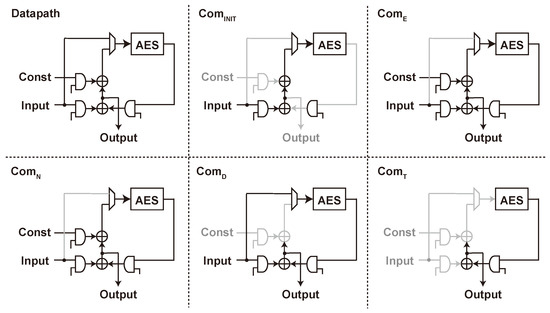 The mode of operation is a thin wrapper by following the previous SAEB and SAEAES implementations [13,15], as shown in Figure 6. The wrapper consists of some 8-bit AND, XOR, and selector gates for changing the datapath depending on the target operation.