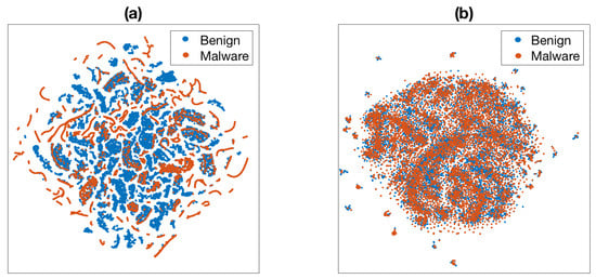 Visualizing the complete benign and malware dataset using the t-SNE algorithm: (a) malware spawned as a separate thread; (b) malware embedded inside benign applications.