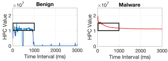 As discussed, in this work, we intend to employ HPCs information to identify the behavior of running applications. As a case study to verify the suitability of using HPCs for ML-based malware detection, we executed malware and benign applications on an Intel Nehalem architecture-based system to observe the behavioral patterns of HPCs. The benign application is selected from MiBench [] benchmark suite and the malware is a Backdoor application that can bypass the authentication process. The observed HPC traces of branch instructions for malware and benign applications are presented in Figure 2. The X-axis represents the time at which the HPC is monitored and the Y-axis represents the branch instruction HPC values.