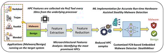 In this section, we describe the proposed machine learning-based approach for effective hardware-based stealthy malware detection. Figure 3 illustrates an overview of different steps for the proposed intelligent malware detection framework. As shown, it is comprised of different steps including data collection and feature extraction, feature reduction, and the proposed ML-based embedded malware detection approach (StealthMiner) each described in detail in the following subsections.
