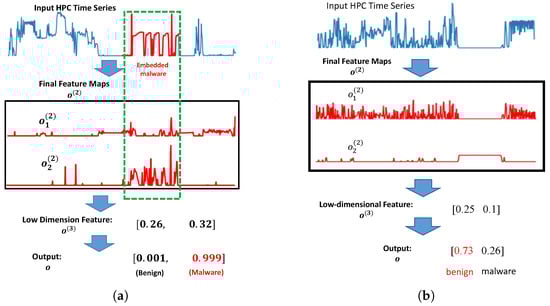 where the weight of all kernels is a 3-d tensor of size . For each , and functions are further applied and four feature maps (denoted as ) are generated. Intuitively, stacking two convolution layers can increase the accuracy of the framework and the ability of the model to detect complicated features which are not possible to be captured by a single convolution layer []. Note that any positive value inside the indicates the potential HPC intervals can be used to determine whether the input HPC time series contains embedded malware. Next, we conduct a global average pooling step to convert feature map into low dimension features. In particular, given a feature map of , we deploy the average value of all elements inside as the low dimension feature. As a result, this step converts into a 2-d vector (denoted as ).