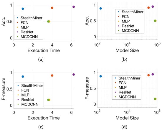 Efficiency analysis StealthMiner as compared with deep learning models. (a) Acc. vs. Execution Time. (b) Acc. vs. Model Size. (c) F-measure vs. Execution Time. (d) F-measure vs. Model Size.