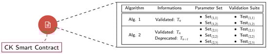 Each algorithm is accompanied by a list of parameter sets, a validation suite, and is furthermore equipped with two more fields: “validated” and “deprecated”: once the Committee decides to add a new algorithm to this list, it also applies a timestamp to the validated field to keep track of the introduction of the new protocol. However, it may happen that new cryptographic discoveries make an algorithm insecure, therefore the Committee may decide to flag some algorithms in the CK smart contract as deprecated, in order to warn the users that those algorithms are not recommended anymore. In this case, the Committee adds the timestamp in the deprecated field. A schematic view of a CK smart contract is shown in Figure 1.