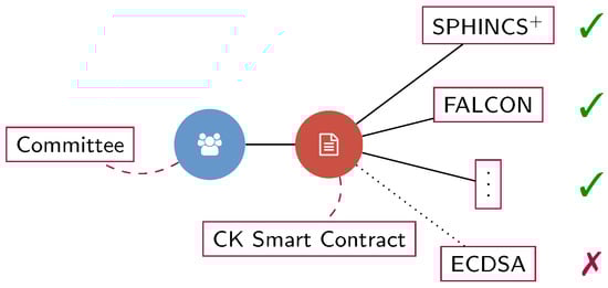 Once an algorithm and an associated parameter set have been chosen, the user can sign the message and send it to the nodes of the network. At any time, all nodes can easily recognize the signature algorithm by comparing the message header and the CK smart contract. Moreover, they can check the validity and security level of the parameters (and so the signature itself) at the time the signature was created. An exemplary scheme is presented in Figure 3.