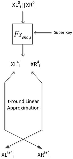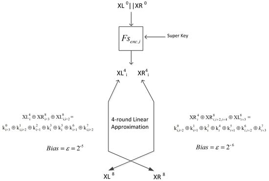 Therefore, we can append the super round to the four-round approximations Equations (3) and (4) to relate the plaintext to the single bit of super round output. Thus, we obtained an approximate relationship between plaintext, ciphertext, and super key bits. This extension enabled us to attack up to eight rounds without further reducing the bias. This gives us the following expressions: