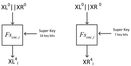 In addition to the 16 and 7 key bits required to obtain the input bits for the left and the right half, respectively, extra key bits were required to evaluate the Equations (9) and (10). Two key bits and were required to evaluate Equation (9) and six key bits , , , , , and to evaluate Equation (10).