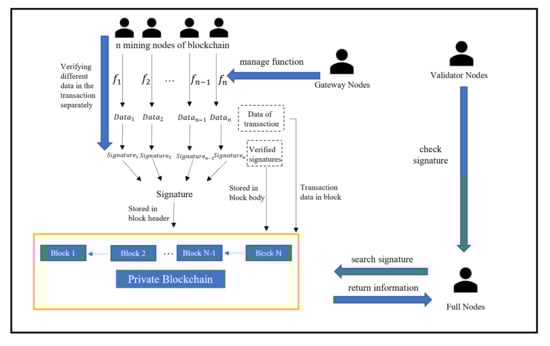 - Each mining node checks different of , divided by function f of functional signatures. After that, the signature corresponding to the respective is generated. Gateway nodes manage the function f of functional signatures using smart contracts.