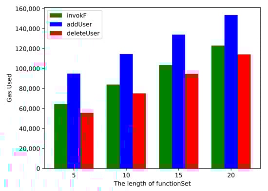 Costs of smart contract deployment and algorithms increase as the functionSet length increases. In this experiment, the cost of deploying smart contract for is $0.973. When the length of functionSet is 10, 15, and 20, the cost of deploying smart contract is $1.144, $1.315, and $1.486. As shown in Table 5 and Figure 5, when , gasPrice of invokeF, addUser, and deleteUser is 64,445 , 94,981 and 55,675 , respectively. Obviously, with the increase of the , the gasPrice required to invoke the smart contract also increases. GasPrice of addUser is always more than invokeF and deleteUser. All gasPrice consumption is reasonable, which indicates that binding function f of the function signature to a private smart contract is valid.
