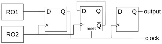 where is the average delay of the RO, is the delay component due to process variations, and is the delay component due to the noise generated in the logic element. Note that depends on multiple factors, such as temperature, humidity, circuit activity, or side effects from the activity of neighboring cells. Therefore, this dynamic delay is the main source of the entropy originating from the RO. The values generated at the output of the RO need to be sampled to generate a random bitstream. The simplest method to perform this sampling is to place a flip-flop (FF) at the output, as shown in Figure 1b, which corresponds to the so-called SRO-FF structure. In this case, the clock input of the FF acts as a sampling signal, at frequency , being . If the clock signal is decorrelated from the output of the RO, presents enough variability (the other delays will remain relatively invariant, as the SRO-FF is implemented in only one logic element, LE), a random bitstream will be obtained. However, the variability of may be not enough to avoid pattern repetitions due the periodicity of the clock and RO output signals. A proposal to overcome this issue is presented in [20], where a second RO (RO2) is used to generate the sampling signal. The output signal of RO2 () feeds a frequency divider in order to maintain the relation . This structure is known as ERO-TRNG [10], and it should be noted that it presents a limitation in the throughput of the RNG, as the output of the frequency divider is used as the clock signal for the system processing the bitstream. Another alternative consists of the structure shown in Figure 2, where the sampling clock signal is generated from two ROs [21], but it has strict requirements in the maximum delay between the two RO feed signals, thus making it necessary to manually place and route them [10]. The use of several ROs acting in parallel and feeding a XOR gate is proposed in [22] and reproduced in Figure 3. This is an interesting proposal, because the use of several ROs in parallel introduces more variability, as we will also have different and values for each RO. On the other hand, in [23]; it is reported that a problem can arise if the XOR gate cannot change its output at the same rate that ROs are changing their states. In this same work, the introduction of a flip-flop between each RO and the input of the XOR gate, thus controlling the input rate to the XOR gate, is proposed to overcome this issue. Other solution was recently proposed in [13], consisting of introducing a latch in the feedback path of each RO. Although these solutions introduce some limitations in the throughput, the additional variability provided by the parallelism of the structure enables compact implementations of TRNGs, as will be studied in Section 4.