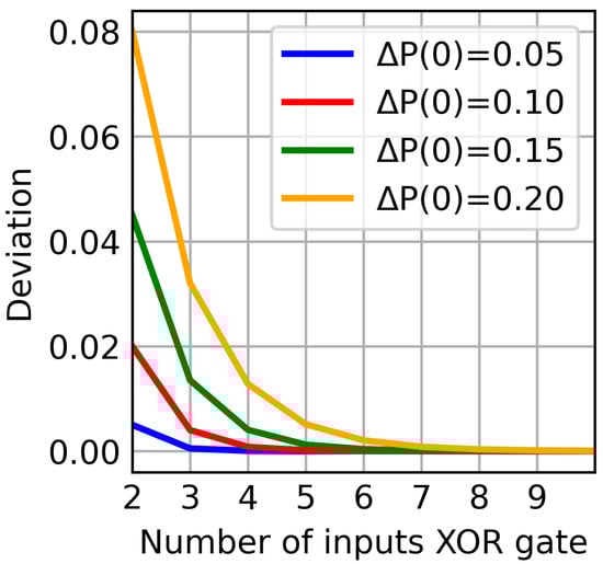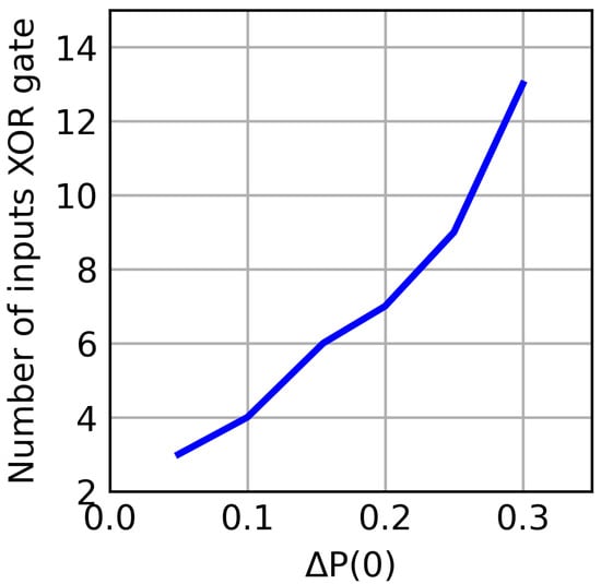 As outlined in the previous section, asymmetry in the probabilities of obtaining a ‘0’ or a ‘1’ at the output of a SARO(k)-FF can be compensated using an XOR gate. Indeed, if we consider a two-input XOR gate and let and be the probabilities of having a ‘0’ at inputs and of the XOR gate, respectively, while and are the probabilities of having ‘1’ at those same inputs, respectively, we find that the probabilities of obtaining a ‘0’ at the output will be