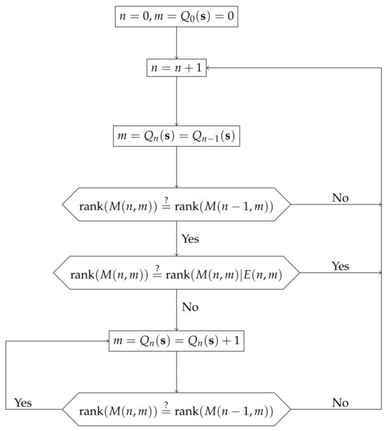For the first n terms of , suppose it can be generated by an m-stage quadratic FSR. Following the recurrence as in Equation (2), we can obtain a system of equations. More concretely, denote