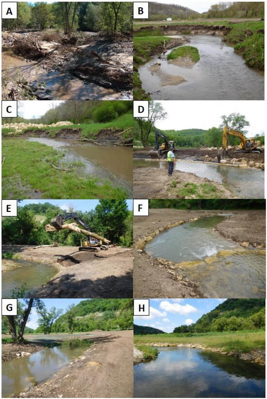 Flood damage in Garvin Brook (A); vertical eroding banks and wide, shallow channels before rehabilitation (B,C); installing the skyhook artificial overhanging bank cover (D) and rootwads (E) in the Garvin Brook rehabilitation reach, summer 2017; grade control structure and plunge pool (F), and completed channels with banks cut back and sloped to allow floodwaters to access the floodplain (G,H).