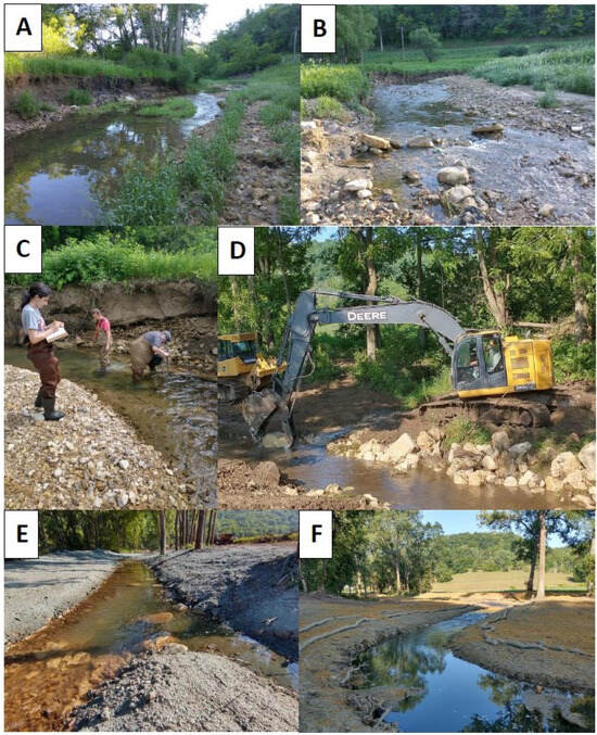 Damaged channels and eroding banks in Cedar Valley Creek pre-project (A–C), installing boulders into a pool (D), and completed sections (E,F) of the Cedar Valley Creek rehabilitation reach, summer 2023. Note the narrow channels, mid-channel boulders, and root wads embedded into the banks in the completed sections. Sloping banks had been seeded and hydro-mulched, and coir fiber rolls were placed to reduce post-construction erosion.