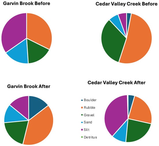 Proportional abundances of stream bottom substrates in rehabilitation reaches of Garvin Brook and Cedar Valley Creek before and after stream rehabilitation.
