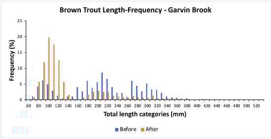 Length–frequency distributions of brown trout collected from random sections within the rehabilitation reach of Garvin Brook before (n = 1068) and after (n = 452) the 2017 stream rehabilitation.