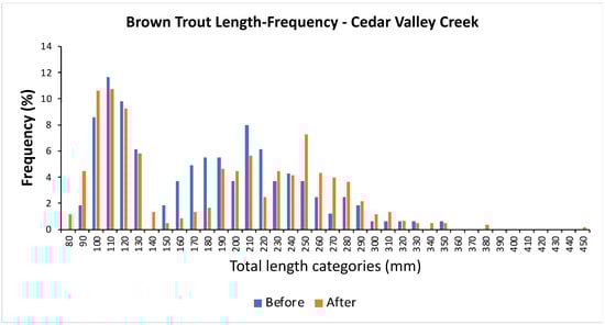 Length–frequency distributions of brown trout collected from random sections within the rehabilitation reach of Cedar Valley Creek before (n = 163) and after (n = 604) the 2023 stream rehabilitation.
