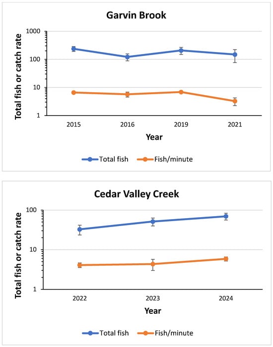 Mean (±one standard deviation) numbers and catch rates (fish/minute) of brown trout collected from random sections within the rehabilitation reaches of Garvin Brook (n = 3 for each year) and Cedar Valley Creek (n = 5 for each year) during the years before and after stream rehabilitation. Garvin Brook trout numbers represent section population estimates from multi-pass sampling and Cedar Valley Creek numbers are based on single-pass depletion sampling. Garvin Brook and Cedar Valley Creek were rehabilitated in 2017 and 2023, respectively.