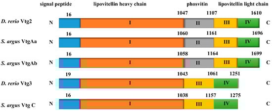 Diagrams of Vtg AA domains. S. argus-Vtg: VtgAa, VtgAb, VtgC and D. rerio-Vtg: Vtg2, Vtg3.