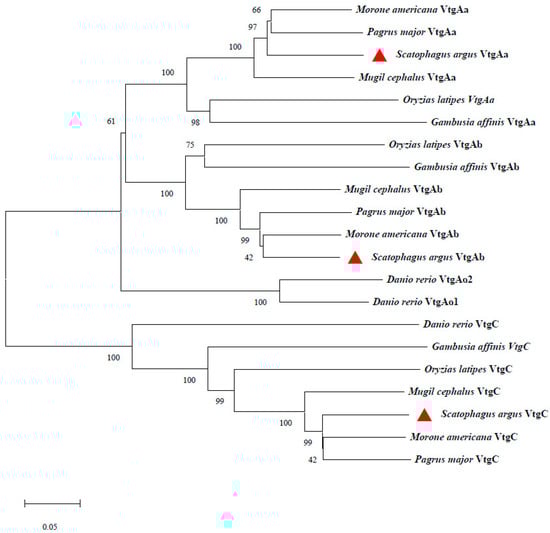 Phylogenetic inferences of the deduced AA sequence of Vtg in S. argus and various teleosts. GenBank accession number: M. americana-Vtg: Vtg Aa (AAZ17415.1), Vtg Ab (AAZ17416.1), Vtg C (AAZ17417.1); O. latipes-Vtg: Vtg Aa (BAB79696), Vtg Ab (BAB79591), Vtg C (ENSORLP00000008173); P. major-Vtg: Vtg Aa (BAE43870), Vtg Ab (BAE43871), Vtg C (BAE43872); D. rerio-Vtg: Vtg Ao1 (NP_001038362), Vtg Ao2 (NP_001038378), Vtg C (AAG30407); G. affinis-Vtg: Vtg Aa (BAD93697.1), Vtg Ab (BAD93698.1), Vtg C (BAD93699.1); S. argus-Vtg: Vtg Aa (KY676847), Vtg Ab (KY654346), Vtg C (KY676848). M. cephalus-Vtg: Vtg Aa (AB288932.1), Vtg Ab (AB288933.1), Vtg C (AB288934.1).