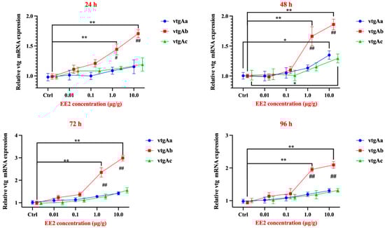 Analysis of S. argus vtg mRNA expression for different processing times and concentrations after injection to EE2. The asterisk above the data point represents significant difference, * p < 0.05, ** p < 0.01 vs. control (Ctrl). The well number below the data point represents significant difference, # p < 0.05, ## p < 0.01 vs. 0.01 and 0.1 μg/g EE2 concentration groups.