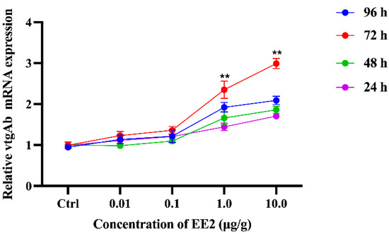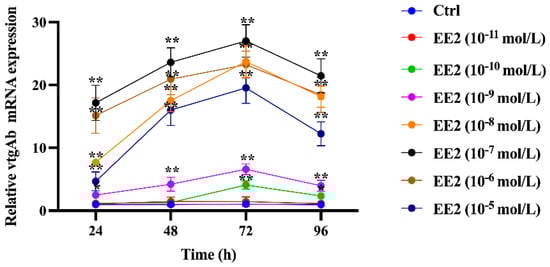 Analysis of vtgAb mRNA expression in S. argus for different processing times and concentrations after EE2 injection. The asterisk above the data point represents significant difference, ** p < 0.01 vs. control (Ctrl).