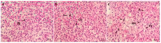 Changes of liver tissue slices under ammonia stress in P. ussuriensis (400×) ((a) CL group; (b) T1L group; (c) T2L group (similarly hereafter)); CV: cytoplasmic vacuolization; K: karyolysis; N: nucleus; NH: nuclear enlargement; S: shrinking; T: transfiguration).