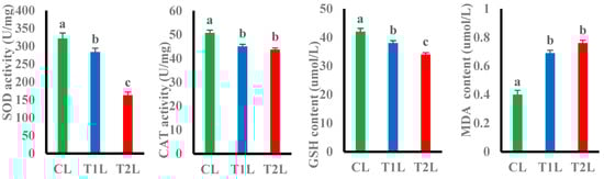 In response to exposure to different levels of ammonia stress, antioxidant indexes in the liver of juvenile P. ussuriensis changed, as shown in Figure 2. After 48 h of exposure, the activities of SOD, CAT, and GSH in TIL and T2L were significantly lower than those in the CL group (p < 0.05). MDA in TIL and T2L was increased significantly (p < 0.05).