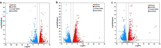 Volcano map of differentially expressed genes. ((a): T1LvsCL; (b): T2LvsCL; (c): T2LvsT1L; Log2FC: Log2 Fold Change).