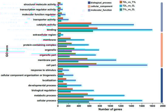 The DEGs from T2LvsT1L, T2LvsCL, and T1LvsCL groups enriched the same GO entries and categories, including biological processes such as the cellular process (GO:0009987) and metabolic process (GO:0008152). The enriched cellular components include the cell part (GO:0044464) and membrane part (GO:0044425). The enriched molecular functions were binding (GO:0005488) and catalytic activity (GO:0003824) (Figure 4).