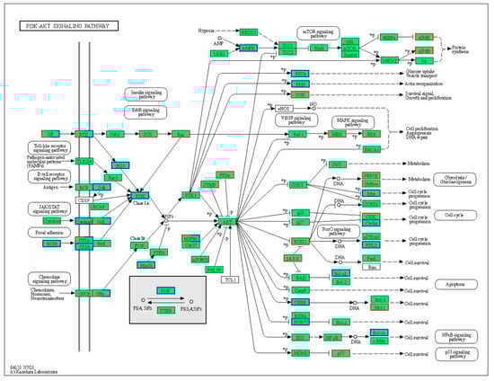 PI3K-AKT signaling pathway in the T2LvsCL (map04151). Note: Red border—upregulated genes/transcripts; blue border—downregulated genes/transcripts. 14-3-3, YWHAE.