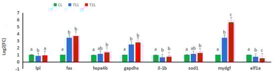 The cDNA was synthesized by reverse transcription using the HiFiScript cDNA Synthesis Kit (Shanghai, China). Next, qPCR was used to analyze eight differential genes (lipoprotein lipase (lpl), fatty acid synthase (fas), heat shock 70 kDa protein 4b (hspa4b), glyceraldehyde-3-phosphate dehydrogenase (gapdhs), interleukin-1 beta-like(il-1β), superoxide dismutase 1(sod1), myeloid-derived growth factor (mydgf), and elongation factor 1-alpha-like (elf1a)). The qPCR primers are listed in Table 1. The 20.0 μL qPCR reaction contained 10.0 μL of 2X Universal SYBR Green Fast qPCR Mix, 0.4 μL of upstream and downstream primers each, 1.0 μL of cDNA template, and 8.2 μL of ddH2O. The amplification program involved pre-denaturation at 95 °C for 3 min; 95 °C (105 s), 60 °C (60 s), and 72 °C (32 s) for 40 cycles; 60 °C (34 s); and 95 °C (15 s). Each sample had three technical replicates. The relative expression was analyzed using the 2−ΔΔCT method [].
