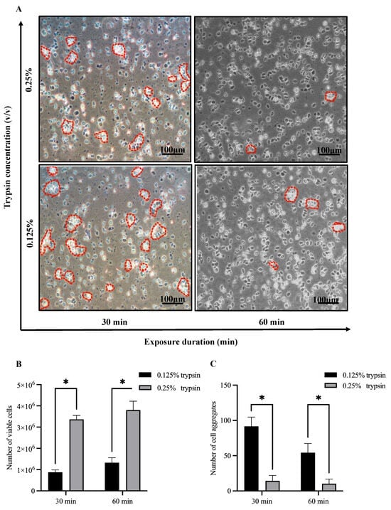 Increased trypsin concentration and prolonged exposure duration led to reduced cell aggregates and increased viable cell numbers. (A) Microscopic analysis of largemouth bass gill tissues following trypsin digestion of indicated concentration and time. Cells were stained in 0.4% trypan blue to exclude dead cells, and cell aggregates are indicated by red dotted circles. Cell aggregates and viable cells were counted, and their numbers are summarized in (B,C), respectively. Data are shown as mean ± SEM. *, p < 0.05.