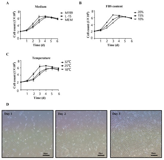 Optimization of culturing conditions for largemouth bass primary gill cells. Primary gill cells were cultured under different conditions to assess impacts of culturing medium (A), FBS content (B) and temperature (C) on their growth kinetics. Cells were seeded at a density of 2 × 105 cells in a 6-well plate and designated as day 0, and cell numbers were counted in the following days. Data are shown as mean ± SEM for three independent experiments. (D) Morphology of primary gill cells over the course of culturing period from day 1 to ~100% confluency at day 3.