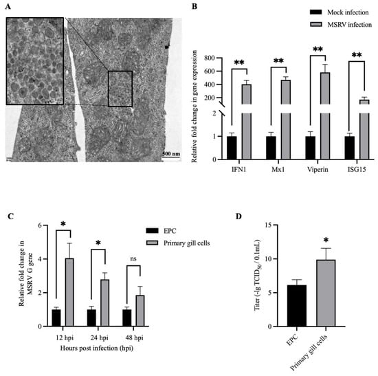 To examine the susceptibility of largemouth bass gill-derived primary cells to MSRV infections, transmission electronic microscopy analysis demonstrated the propagation of viral particles within host cells (Figure 3A). Further qRT-PCR results showed that primary cells were responsive to viral infections and expressions of anti-viral genes, and IFN1, Mx1, Viperin and ISG15 were all significantly up-regulated, with Viperin exhibiting the highest increase of ~582 fold (Figure 3B). We further compared expression levels of viral G genes in MSRV-infected primary cells to those of CPE cells; qRT-PCR analysis showed a significant increase in viral G genes expression at early time points (i.e., 12 and 24 hpi) compared to CPE cells, whereas at 48 hpi, the expression level of viral G genes was not significantly different, even though a slightly higher expression was observed in largemouth bass gill-derived primary cells (Figure 3C). A viral titration assay further confirmed that the TCID50 of largemouth bass gill-derived primary cells was significantly higher than that of EPC cells, indicating a higher susceptibility of the primary cells to MSRV infection (Figure 3D).