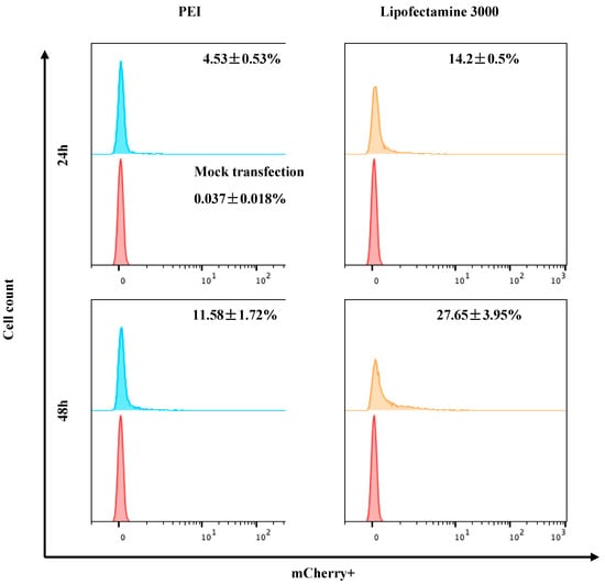To investigate the possibility of exogenous gene manipulations, largemouth bass gill-derived primary cells were transfected with mCherry plasmid using polyethylenimine and Lipofectamine 3000. Flow cytometry analysis demonstrated an increase in percentages of mCherry-positive cells with extended transfection times; of the two transfection reagents tested in this study, Lipofectamine 3000 exhibited the highest transfection efficiency compared to polyethylenimine at both time points, with 14.2 ± 0.5% and 27.65 ± 3.95% mCherry-positive cells at 24 and 48 h, respectively (Figure 4).