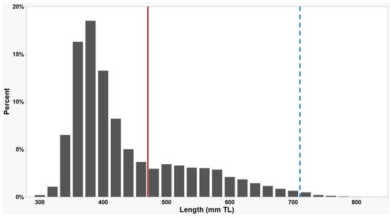 Length frequency distribution of Spotted Seatrout Cynoscion nebulosus (n = 22,338) captured in gill net samples along the Texas coast from 1983 to 2023. The vertical red line indicates the mean length of trout (473 mm TL). The dashed blue line indicates the minimum length of trophy-class trout (712 mm).