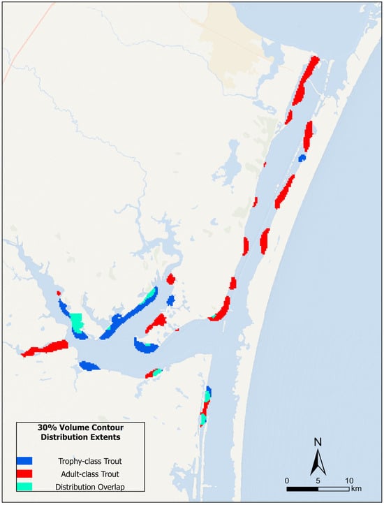 Thirty-percent volume contour distribution extents of trophy-class (blue) and adult-class (red) Spotted Seatrout Cynoscion nebulosus based on occurrence in gill net samples collected throughout the Upper Laguna Madre from 1983 to 2023. Overlaps in distribution extent between the two size classes are also shown (green).