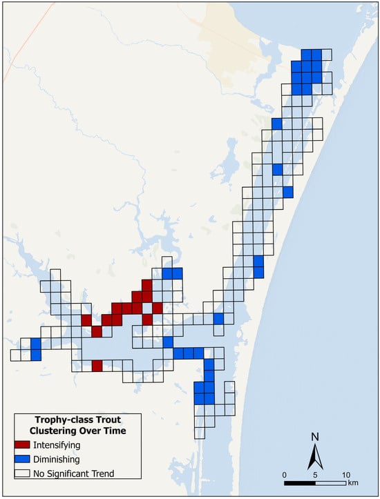 To investigate how spatial patterns of trophy-class trout may have changed over time, Space Time Pattern Mining statistical tools were used to evaluate temporal trends in spatial clustering. As with hot spot analysis, the Gi* Statistic was calculated by aggregating gill net presence point data into TPWD sampling grids. Whereas hot spot analysis treated the entire dataset as a single event, the completion date of each sample was used to group catch data into 4-year bins, resulting in 10 point aggregation bins for each sampling grid. Emerging Hot Spot Analysis was used to calculate the Gi* Statistic for each bin. The Emerging Hot Spot Analysis geoprocessing workflow then performed Mann–Kendall trend tests on the series of Gi* z-scores at every sampling grid. The Mann–Kendall test is a nonparametric, monotonic analysis used to test for a significant increase or decrease in a response variable over time [38]. Here, significant (p < 0.05) positive trends were interpreted as intensifying trophy-class trout clustering (i.e., accounting for an increasing proportion of the study area’s total catch over time), while significant negative trends were interpreted as diminishing clustering (i.e., accounting for a decreasing proportion of the study area’s total catch over time).