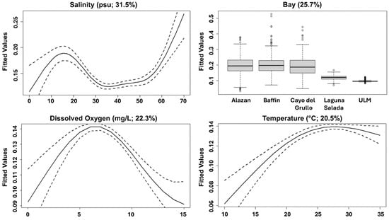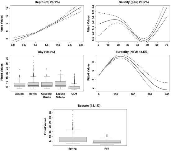Separate BRTs were constructed for trophy-class and adult-class trout to compare predictors of abundance (including zero catches) between the two size classes. Predictor variables assessed in each model included the bay, season, water temperature, depth, salinity, turbidity, and DO of each gill net sample throughout the study period. Measures of temporal variation (e.g., year) were not included in BRTs in order to maintain focus on environmental predictors of abundance. For each size class, a cross-validation procedure was utilized to determine the optimal number of boosting trees assuming a Poisson error distribution, a default tree complexity of 7 nodes, a bag fraction of 0.5, and a learning rate of 0.001 (see [40] for more details on the selected parameters). Each cross-validated model was simplified using recursive feature elimination, in which predictor variables were systematically removed and the predictive deviance was compared to the original model (containing all variables). The lowest contributing variables for each model were removed, and final simplified models were created. The relationships between the abundance of each size class and the associated predictor variables were visualized by fitting a generalized additive model (GAM) spline to the plot for each selected variable using the “mgcv” package in R version 4.3.2 [43].