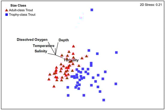 To determine whether unique communities of species were associated with the occurrence of trophy-class and adult-class trout, species abundance data were compiled for each gill net sample that contained one or more trout of either size class. Samples were then grouped (trophy class or adult class) based on the size class of the trout captured in the gill net; samples that contained trout of both size classes were designated as trophy-class samples. This method of binning samples was only used for multivariate analyses. All multivariate analyses were conducted in Primer-E version 7.0 software. Shade plots were created from species abundance data to determine the relative species contributions, and the data were fourth-root transformed prior to analyses because the samples were heavily dominated by a few species [44]. A Bray–Curtis similarity matrix was constructed from the transformed data and a one-way permutation-based analysis of variance (PERMANOVA) was run with type III (partial) sum of squares and an unrestricted permutation of raw data to test for differences in fish communities associated with trophy-class and adult-class trout [44,45]. A permutation-based analysis of dispersion (PERMDISP) was then used to test for the homogeneity of multivariate dispersion among size classes [46]. Due to the large sample size, samples were averaged by year for each size class, and non-metric multidimensional scaling (mMDS) was generated to visualize the differences in communities associated with trophy-class and adult-class trout [44,45]. Vectors showing environmental variables (dissolved oxygen [mg/L], depth [m], temperature [°C], salinity [psu], and turbidity [NTU]) were overlaid onto the plot in order to visualize relationships with each size class. One-way similarity percentage analyses (SIMPER) were used to quantify the contribution of individual species to the similarity and dissimilarity among groups [45].