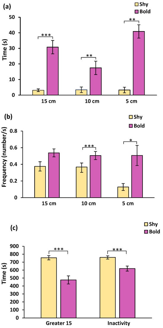 (a) Mean (±SE) time that fish spent in the 15,10, 5 cm zone (s), between bold and shy rainbow trout across the three novel object tests. (b) Mean (±SE) of the frequency that fish entered the 15, 10, 5 cm zone, between bold and shy rainbow trout across the three novel object tests. (c) Mean (±SE) time that fish spent in greater distance than 15 cm and inactivity time (s), between bold and shy rainbow trout across the three novel object tests (n = 16, bold; n = 16, shy; * p < 0.05; ** p < 0.01; *** p < 0.001).