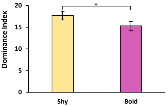 Mean (±SE) of the dominance index during pair-wise contests in rainbow trout (n = 16, bold; n = 16, shy; * p < 0.05).