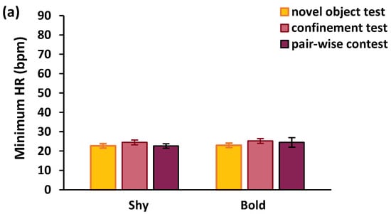 The minimum heart rate was similar when comparing bold and shy (F(1,90) = 0.367, p = 0.546) between the three tests (F(2,90) = 0.581, p = 0.561), and there was no significant interaction between boldness and test type (F(2,90) = 0.092, p = 0.912) (Figure 3a).