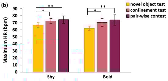 (a) Mean (±SE) of the minimum value of the heart rate (HR, in beats per min, bpm) during the novel object test, confinement test and pair-wise contest in rainbow trout (n = 16, bold; n = 16, shy). (b) Mean (±SE) of the maximum value of the heart rate during the novel object test, confinement test and pair-wise contest (n = 16, bold; n = 16, shy; * p < 0.05; ** p < 0.01). No significant differences were found between bold and shy animals.