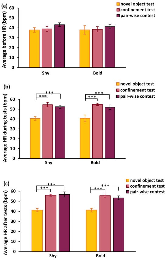 (a) Mean (±SE) of the average resting heart rate (HR, in beats per min, bpm) before the three tests (novel object test, confinement test, and pair-wise contest) between bold and shy rainbow trout (n = 16, bold; n = 16, shy). (b) Mean (±SE) of the average heart rate during the three tests (novel object test, confinement test, and pair-wise contest) between bold and shy (n = 16, bold; n = 16, shy). (c) Mean (±SE) of the average resting heart rate after the three tests (novel object test, confinement test, and pair-wise contest) between bold and shy (n = 16, bold; n = 16, shy; *** p < 0.001). No significant differences were found between bold and shy animals.