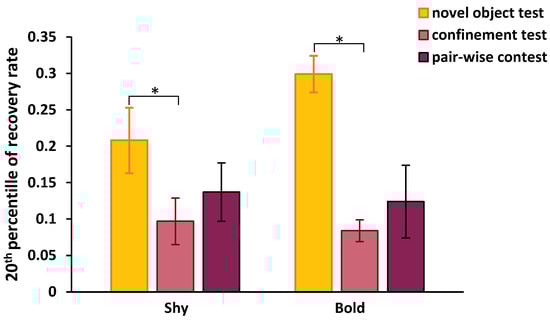 Mean (±SE) of the 20th percentile of recovery rate between the three competitions (novel object test, confinement test, and pair-wise contest between bold and shy rainbow trout (n = 16, bold; n = 16, shy; * p < 0.05). The 20th percentile of the recovery rate is defined as the 20th percentile of all measurements during the test divided by the recovery time. No significant differences were found between bold and shy animals.