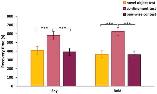 Mean (±SE) of the recovery time between the three competitions (novel object test, confinement test, and pair-wise contest) between bold and shy rainbow trout (n = 16, bold; n = 16, shy; *** p < 0.001). No significant differences were found between bold and shy animals.