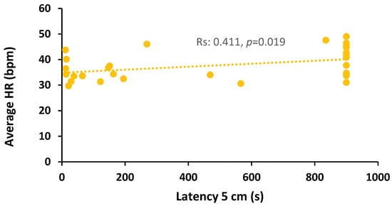 There was a positive relationship between the latency to approach the novel object in 5 cm and the average heart rate before the novel object test (Rs: 0.411; p = 0.019) (Figure 7). No other correlations were significant between the novel object behavioral data and heart rate (Table S4A). There were also no significant correlations between the values of the confinement test and the heart rate data (Table S4B).