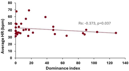 The dominance index from the pair-wise contest and the biologger data during the pair-wise contest was significantly correlated with a negative relationship between the dominance index and the average heart rate before the pair-wise contest (Rs: −0.373; p = 0.037) (Figure 8, Table S4C).
